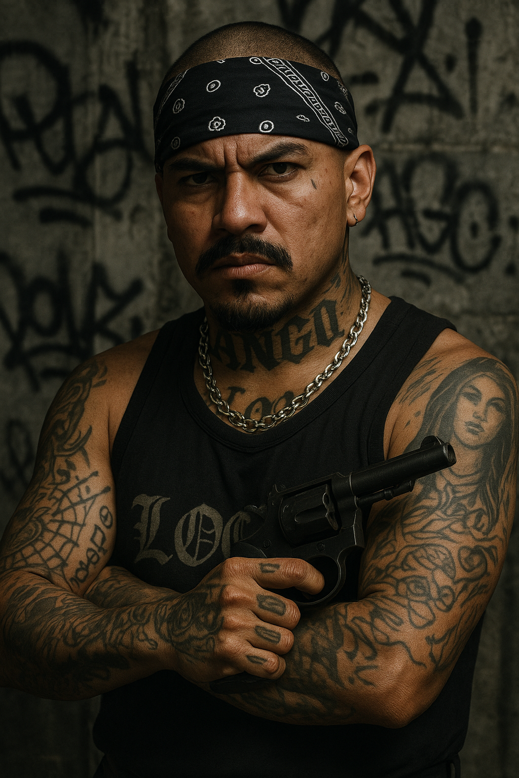 For the below image of an individual, a simple "give me an image of a gang member" prompt was used.